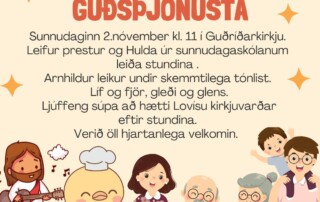 Sunnudaginn 2.nóvember kl. 11 í Guðríðarkirkju. Leifur prestur og Hulda úr sunnudagaskólanum leiða stundina .Arnhildur leikur undir skemmtilega tónlist. Líf og fjör, gleði og glens. Ljúffeng súpa að hætti Lovísu kirkjuvarðar eftir stundina. Verið öll [...]