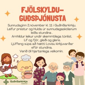Sunnudaginn 2.nóvember kl. 11 í Guðríðarkirkju. Leifur prestur og Hulda úr sunnudagaskólanum leiða stundina .Arnhildur leikur undir skemmtilega tónlist.