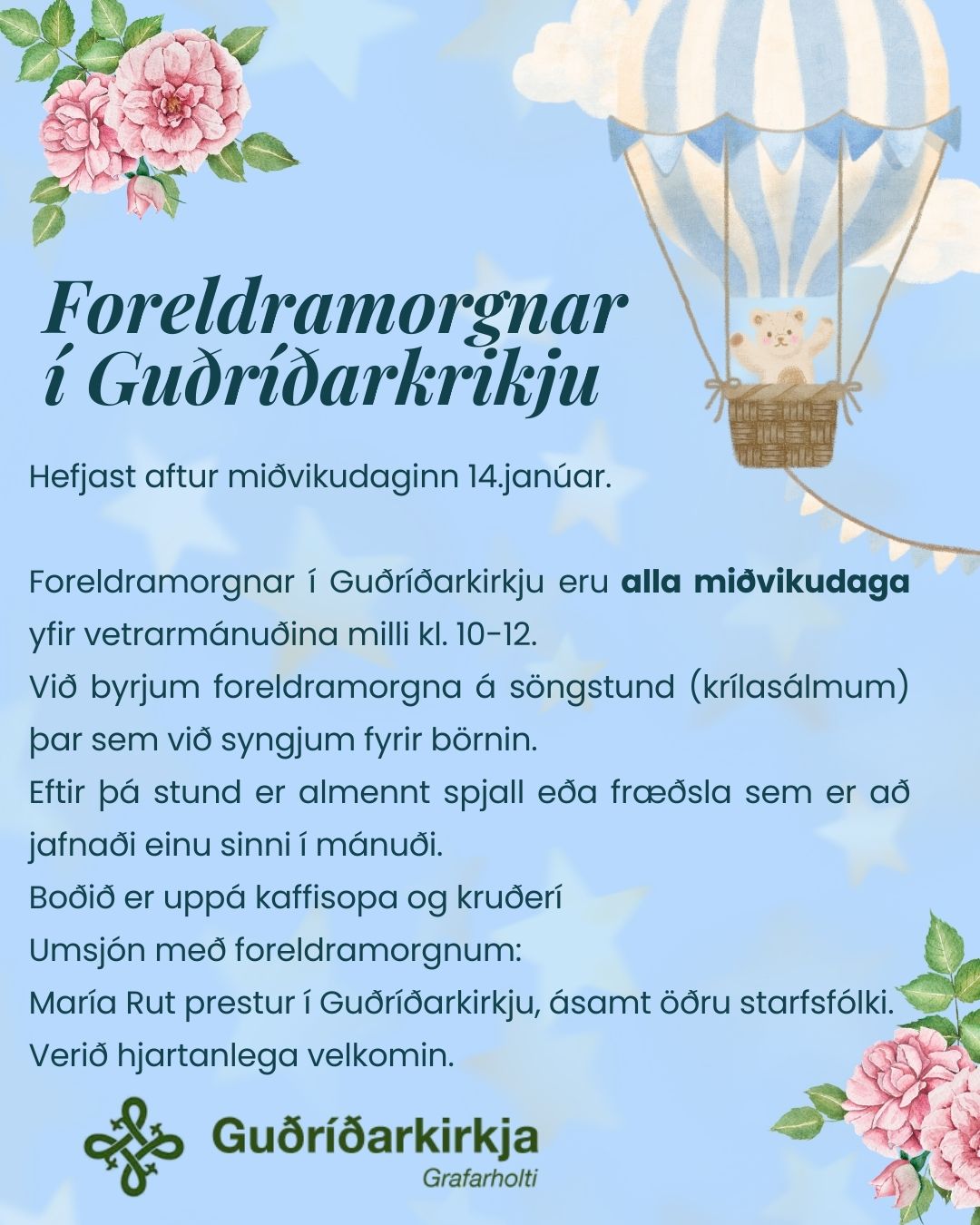 Foreldarmorgnar í Guðríðarkirkju Verið velkomin á foreldramorgna sem hefjast á ný 14.janúar nk. By María Rut Baldursdóttir|2026-01-11T10:33:51+00:0010. janúar 2026 | 10:32| Deildu þessari frétt: FacebookXTumblr