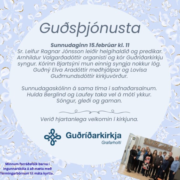 Sr. Leifur Ragnar Jónsson leiðir helgihaldið og predikar. Arnhildur Valgarðadóttir organisti og kór Guðríðarkirkju syngur. Kórinn Bjartsýni mun einnig syngja nokkur lög.