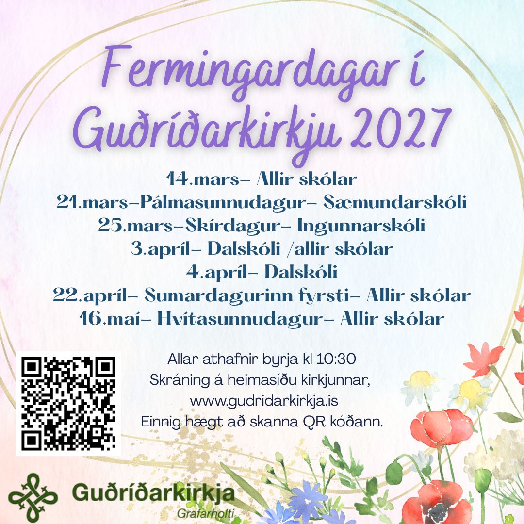 Fermingardagar í Guðríðarkirkju: 14.mars- Allir skólar 21.mars-Pálmasunnudagur- Sæmundarskóli 25.mars-Skírdagur- Ingunnarskóli 3.apríl- Dalskóli /allir skólar 4.apríl- Dalskóli 22.apríl- Sumardagurinn fyrsti- Allir skólar 16.maí- Hvítasunnudagur- Allir skólar Allar athafnir byrja kl 10:30 Skráning HÉR