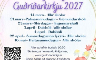 Fermingardagar í Guðríðarkirkju: 14.mars- Allir skólar 21.mars-Pálmasunnudagur- Sæmundarskóli 25.mars-Skírdagur- Ingunnarskóli 3.apríl- Dalskóli /allir skólar 4.apríl- Dalskóli 22.apríl- Sumardagurinn fyrsti- Allir skólar 16.maí- Hvítasunnudagur- Allir skólar Allar athafnir byrja kl 10:30 Skráning HÉR