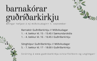 Barnakórar Guðríðarkirkju æfa á miðvikudögum veturinn 2018 – 2019. Æfingatímar eru eftirfarandi: Barnakór Guðríðarkirkju: 1. – 4. bekkur Kl. 15:00 – 15:45. Staðsetning: Sæmundarskóli Kl. 16:00 – 16:45. Staðsetning: Guðríðarkirkja. Sönghópur Guðríðarkirkju: 5. – 7. bekkur Kl. [...]