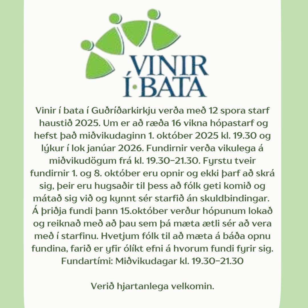 haustið 2025. Um er að ræða 16 vikna hópastarf og hefst það miðvikudaginn 1. október 2025 kl. 19.30 og lýkur í lok janúar 2026. Fundirnir verða vikulega á miðvikudögum frá kl. 19.30-21.30. Fyrstu tveir fundirnir 1. og 8. október eru opnir og ekki þarf að skrá sig, þeir eru hugsaðir til þess að fólk geti komið og mátað sig við og kynnt sér starfið án skuldbindingar.