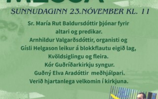 Messa sunnudaginn 23. nóvember í Guðríðarkirkju kl. 11. Sr. María Rut Baldursdóttir þjónar fyrir altari og predikar. Arnhildur Valgarðsdóttir, organisti og Gísli Helgason leikur á blokkflautu eigið lag, Kvöldsiglingu og fleira. Kór Guðríðarkirkju syngur. Guðný [...]