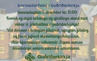 Jólaball barnastarfisins í Guðríðarkirkju sunnudaginn 7. desember kl. 11:00 Komið og eigið notalega og gleðilega stund með okkur á jólaballinu í Guðríðarkirkju! Við dönsum í kringum jólatréð, syngjum jólalög og fáum jafnvel skemmtilega heimsókn. Allir [...]